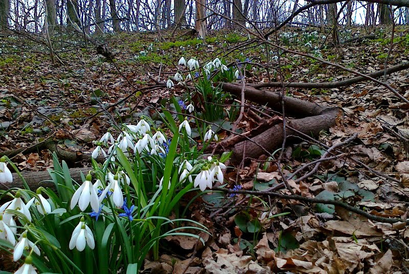 Не смотря на огромную антропогенную нагрузку (что следуют перевести как - "по лесу ходят люди в большом количестве, жгут костры, рвут цветы, мусорят, и прочие нехорошие излишества себе позволяют). Так вот, не смотря на все это - там все еще растут настоящие подснежники.